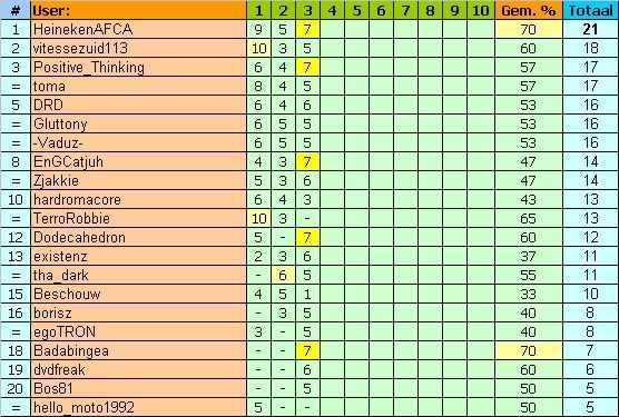 Ik zal je eerlijk zeggen, ik heb er helemaal geen één opgezocht. Gewoon geluk gehad dus. Kijk maar na bij voorgaande edities, ik stond altijd ergens onderaanquote:Op woensdag 4 april 2007 20:35 schreef RayMania het volgende:
