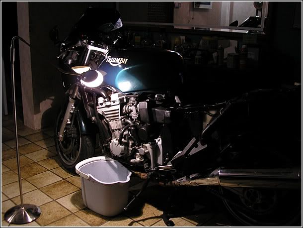 Ik dacht ineens, laat ik het weekend nog ff goed afsluiten en snel e.a. voorbereiden voor de K&N luchtfilter installatie.Gaskabel los om de carbs uit te bouwen, het luchtfilterhuis wilde ik lossen... heeee...