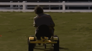 Hylarisch is dus met hoed en zonnebril op een kinderkarretje over een parcours sjeezen, tja hylarisch