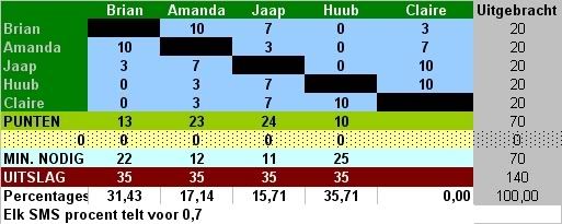 De punten zijn op dit moment : Jaap (24) - Amanda (23) - Brian (13) - Huub (10) = Totaal 70 punten.