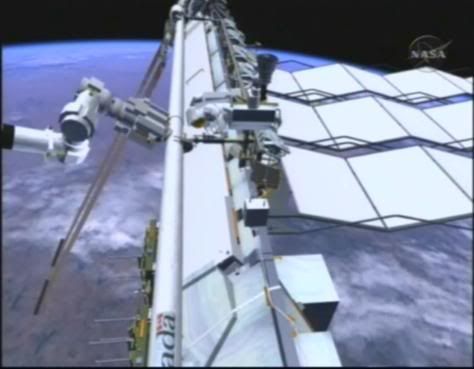 Dit is een van de astronauten aan boord van de Space Shuttle. Het lijkt wel of ze Amanda's pruik draagt maar ze is natuurlijk gewichtloos.