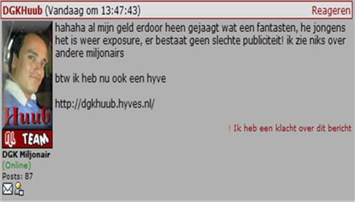 JdM kan maar beter zijn zaakjes de voilgende keer goed voor elkaar hebben. Huub en consorten raad ik aan contact op te nemen met de arbeidsinspectie. In mijn ogen kan het niet zo zijn dat zij daar gratis hebben moeten werken en op de koop toe ook nog eens allemaal bedreigingen moeten incasseren en buiten DGK nu beveiliging nodig hebben. Een beveiliging die veel geld kost maar als ex-wannabee zelf geen cent in de zak. Ronduit schandalig.
