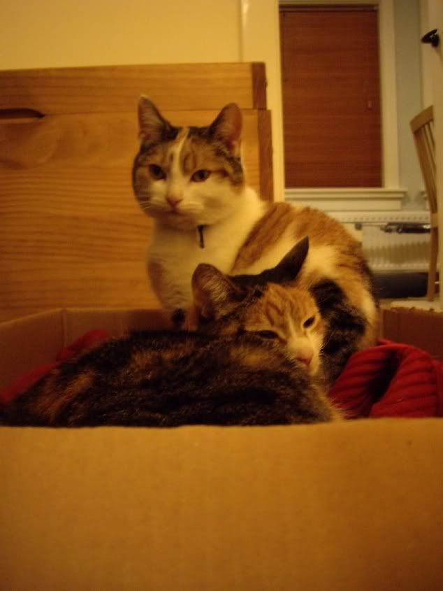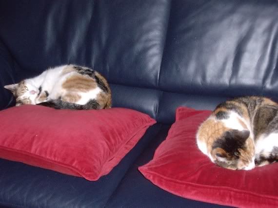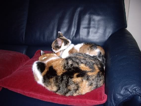 Na lange tijd weer een update. De dames krijgen nu wat meer vertrouwen in elkaar, en zijn nog niet de dikste vriendinnen maar het gaat steeds beter. Dat moet ook, wij zijn nog erg druk met de verbouwing en zo kunnen ze mooi elkaars speelmaatje zijn. Spelen doen ze wel, maar niet hyper en ook niet lang. Dat komt ook omdat we helaas van de Carnibest (rauw vlees-methode) hebben moeten afstappen, en weer teruggegaan zijn naar Hills brokjes. Malkah begon op een dag enorm over te geven, MM ook, maar minder. MM herstelde snel maar Malkah niet en zij heeft een enorme rotdag toen gehad. Vanaf dat moment wilde noch MM noch Malkah ook maar in de buurt komen van de Carnibest. Dit hebben we een dag aangezien en toen moésten we wat doen. Katten mogen immers niet te lang zonder eten. We hadden nog een restantje Hills als back-up en gelukkig maar. Malkah, nog ziekjes, MM ook verzwakt maar wel met spitse oortjes kwamen aanvliegen en nog nooit heb ik die katjes zo snel zien lopen naar hun bakje. Affijn, helemaal happy cats. Dan maar niet het optimale eten, maar wel happy cats. Omdat beide dames de neiging hebben tot dichtgroeien, gaan we binnenkort verder met Hills light versie. MM(vooraan) vind Malkah nu niet meer zo bedreigend en ligt dus nu naast haar ![]() Wij doen alsof we slapen ![]() Links Malkah, rechts MM ![]() Voor het eerst Malkah een likje gegeven, hoera! ![]() | |