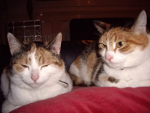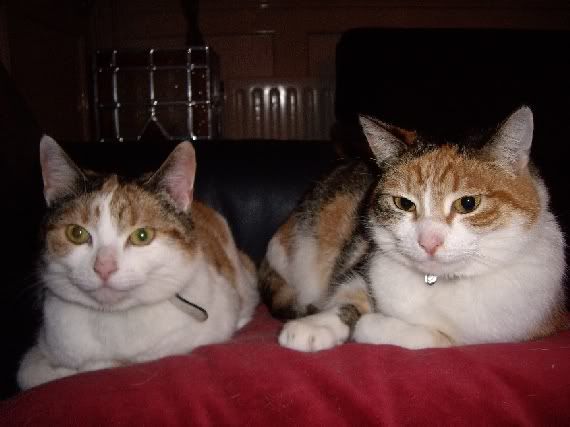 Ja het gaat nog steeds erg goed, zowel met Malkah als MM. We waren pas geleden een beetje bang, we moesten met de dames naar de dierenarts voor de jaarlijkse entingen. Het beviel Malkah maar niets in het mandje, ze begon weer erg hard te miauwen. De dierenarts echter, vond ze geen probleem. Nu hebben we haar in het mandje laten zitten, zodat ze niet kon ontsnappen. Ze liet zich gewoon inspuiten en haar neusje druppelen met spul waardoor ze afgelopen weekend ziek zou worden (ingespoten met verzwakt virus van iets, vergeten wat het was). Beide dames waren wat zwakjes en vandaag niesde Malkah zo hard dat ik bijna een zakdoek wilde pakken. Beide poezen hebben nu al geen siep oogjes meer en zitten al weer achter elkaar aan. Malkah leek na het bezoek aan de dierenarts meer vertrouwen in ons te hebben gekregen, terwijl we het tegenovergestelde hadden verwacht. Zo van: ik was even weg maar ik ben nu weer thuis. Overigens doen we het in overleg met Zwolle nu al weer een tijdje zonder de Bach druppels, en dat gaat erg goed. Malkah lijkt nog meer los te komen, het wordt een steeds leuker poesje. Ze laat zich nu echt de kaas niet meer van het brood eten door MM, eerder andersom. Hieronder: Malkah links, MM rechts ![]() | |