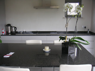 Mooie donkere granieten werkblad (gezien de tegels op de vloer) zou het chique maken