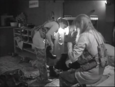 Eline is bezig met haar kisten en probeert van alles met haar broekspijpen om "te kijken wat het leukste staat hihi".