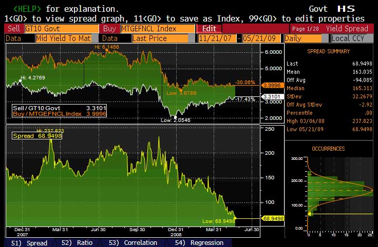 The spread between the 10 Yr UST and the 30 Year current coupon mortgage index has collapsed to the tightest level in 2009. If the selloff in 10 Year bonds continues for another 68 bps (at this rate that would be achieved in about 3 hours), it will be cheaper to finance a mortgage compliments of bankrupt Fannie and Freddie, than to issue US Sovereign debt.