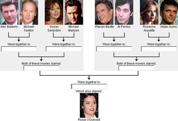 Ik wist direct de Baldwin en Keaton connectie en de Beatty en Pacino connectie. Aangezien O'Donnell al gegeven was en ik maar 1 film ken met O'Donnell, Madonna en Davis was de rest kinderspel.....