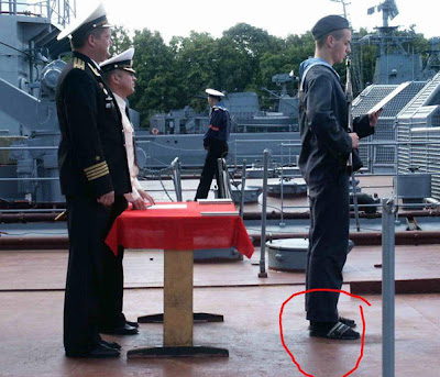 quote: Die matroos zal wel iets met zijn voet hebben, dan is het gewoon protocol om in slippers te lopen, als het minder erg is sportschoen. | |