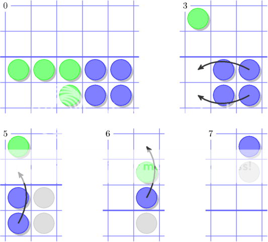 De notatie gebruiken we verder ook: een pijltje geeft aan welke steen verzet gaat worden, linksboven staat het aantal gedane zetten (0 is dus de begin situatie) en een grijs rondje is een steen die is verdwenen omdat er overheen gesprongen is.
