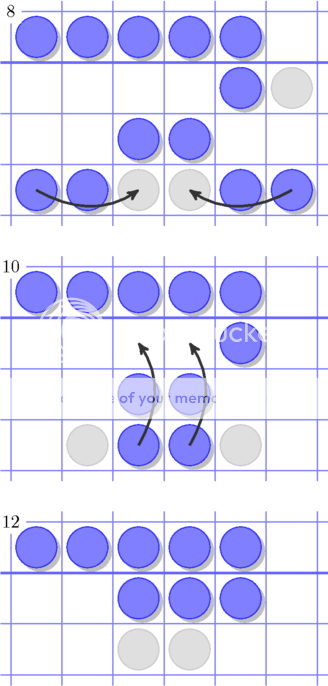 Oké, boeiend denk je misschien, maar wat is nu het punt? Solitair spelen is niet zo spannend. Het geval is namelijk dat de volgende uitdaging, namelijk een steen op 5 regels boven de blauwe streep krijgen als je met al je stenen eronder begint überhaupt niet mogelijk is. Hoeveel stenen je ook pakt, hoe je ook beweegt, wat je ook doet, je zult nooit een steen op de vijfde regel krijgen.