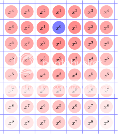 Eerst kiezen we maar eens een punt op de 5e regel (dat is blauw gekleurd hieronder) en dat punt kennen we een bepaald gewicht toe, namelijk: 1. De buurtpunten, die met één stap zijn te bereiken, kennen we gewicht x1 toe (wat x is zullen we later nog specificeren), de velden die met twee stappen bereikbaar zijn kennen we x2 toe, met drie x3, en zo voort, je krijgt dus deze situatie: