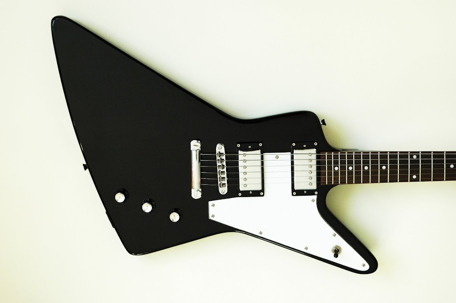 De gitaar is echt helemaal krasvrij enz en lijkt heul veul op een echte gibson. VOlgens mij komt 'ie uit Korea. Instant U2 en metallica spelen dus.