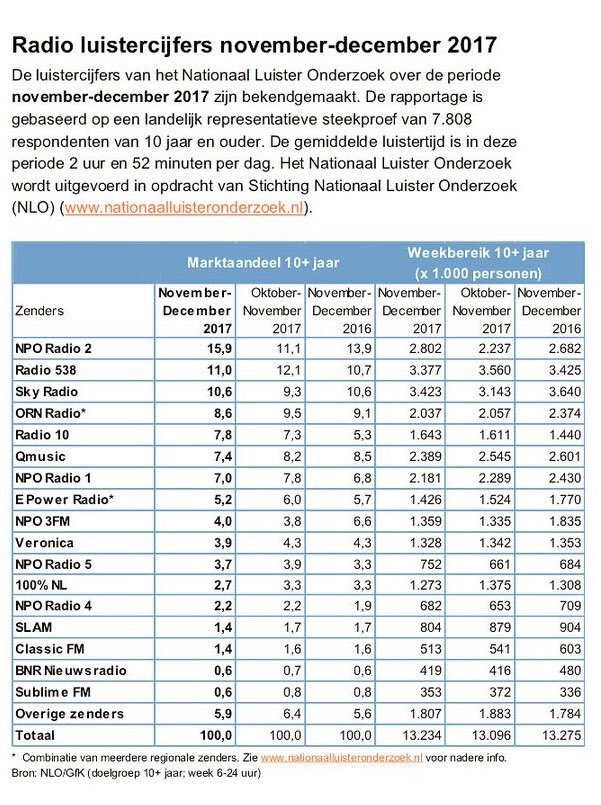 quote:Radio 538 is weer marktleider. Dat blijkt uit de vanochtend gepubliceerde luistercijfers over de periode juni-juli 2018. De zender herovert weer de koppositie op NPO Radio 2. Qmusic en NPO Radio 1 doen goede zaken en winnen 0,6 procentpunt ten opzichte van de vorige periode.