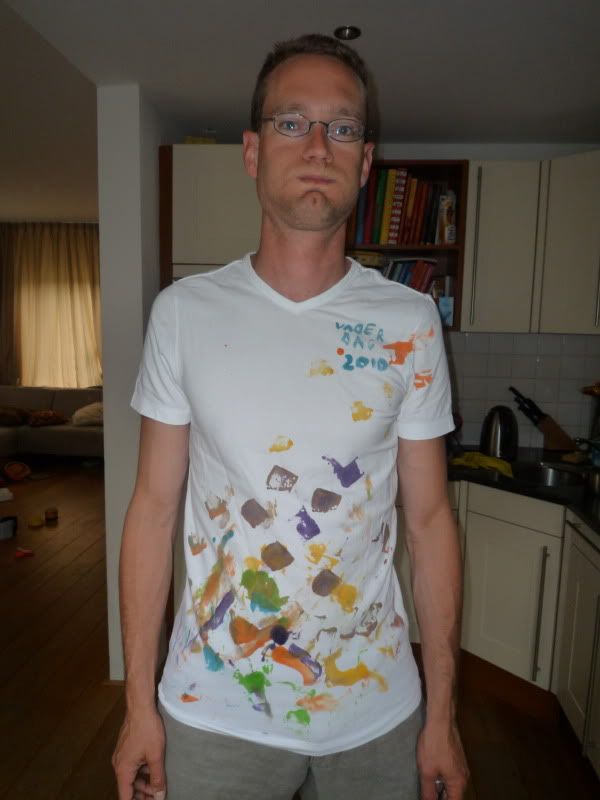 Hier vanmiddag ook nog even gekliederd. Met Huup's vuilniszakken in gedachten maar even een schort geknutseld. Bodypainten in luier/ondergoed...