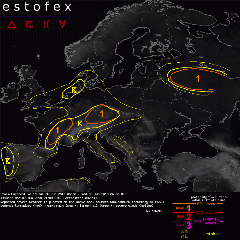 quote:A level 1 surrounding the level 2 was issued for most parts of W Germany, France, Benelux and NE Spain mainly for large hail and severe wind gusts.