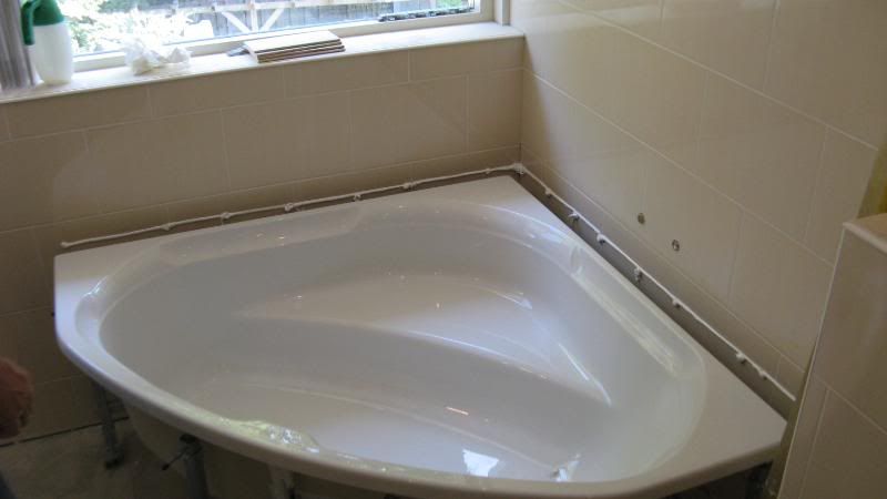 | Ziet er echt netjes uit. Mooie keuze tegels ook. Alleen 1 vraagje zo'n hoek bad hoef je die niet te ondersteunen door middel van muurtje ? | |
