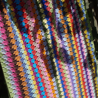de randen worden idd ook granny. 2 rondes oranjeroze, dan 2 randen rood, 2 randen paars, en ik denk afsluitend nog twee randen vasten in lichtblauwgroen met afsluitend deze edging in petrolblauw (of ik doe die bobble edging meteen achter paars aan)
