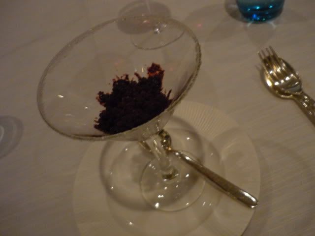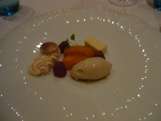 Het hoofdgerecht was drie bereidingen van lam, een rosé gebakken stukje, wat stoofvlees en een saucijsje met anijs. Daarbij zat risotto met eekhoorntjesbrood, gegrilde courgette, peultjes en een soort kroketje van volgens mij knolselderijpuree. Ik vond het stoofvlees hierbij erg lekker, vriend vond dat juist wat minder. Verder miste er misschien iets frissigs, maar lekker was het zeker.