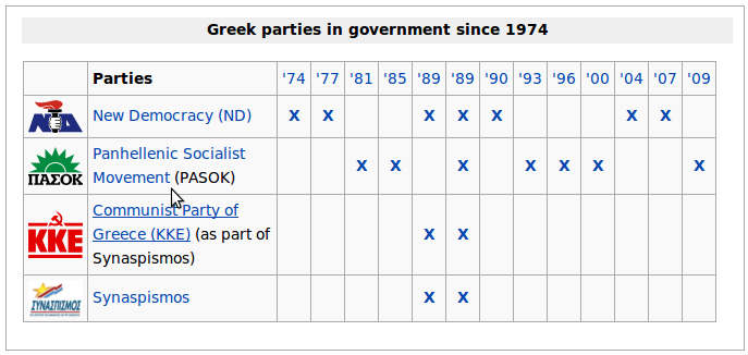 Nee hoor, links is ongeveer net zoveel aan de macht geweest als rechts de laatste 36 jaar in Griekenland:quote: