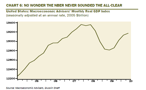 Interessant als dit uit gaat komen. De Treasury markets prijzen dit scenario al heel lang in, maar de aandelenmarkten niet!quote:Our suspicions have been confirmed — the recession never ended. Macroeconomic Advisers produces a monthly U.S. real GDP series and it shows that the peak was in April, as we expected, with both May and June down 0.4% in the worst back-to-back performance since the economy was crying Uncle! back in the depths of despair in September-October 2008.