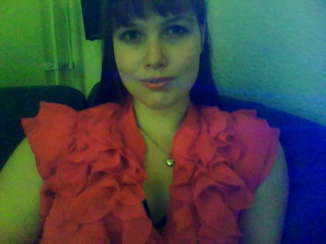 Brakke webcamfoto maar het is vuurrood met veel ruchesspijkerrokje eronder en heels