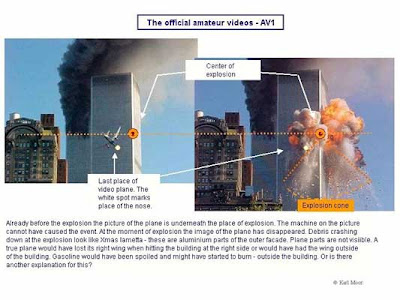 De foto's van de toestellen die op het punt staan de torens te rammen zijn natuurlijk fake. Het wordt gewoon gebruikt als vals ondersteunend bewijs.