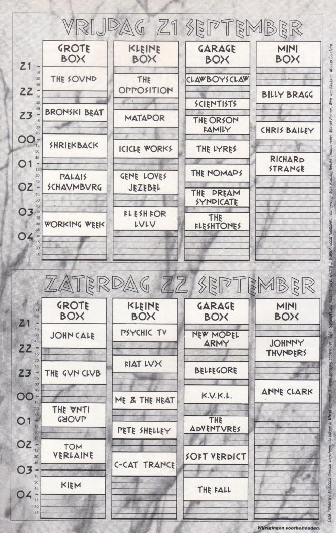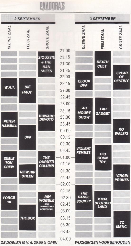 Nog mensen die tussen '83 en '85 naar Pandora Music Box festival geweest zijn in de Doelen te Rotterdam? Wat een prachtige lijst met bands....jammer dat je moest kiezen, omdat er in meerdere zalen werd opgetreden. Voor mij de kennismaking met een hoop bands waar ik nog steeds met veel plezier naar luister. Palais Schaumburg, Echo, Kowalski, Neubauten, Virgin Prunes, Sound, Shrieckback, Nick Cave, The Fall en vele vele anderen. Prachtig.