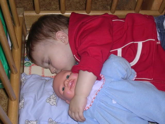 Grappig, he, dat het ene kind het ingebakken heeft en de ander er niet naar taalt. Lieve fotoal heeft die pop wel een heel eng lachje