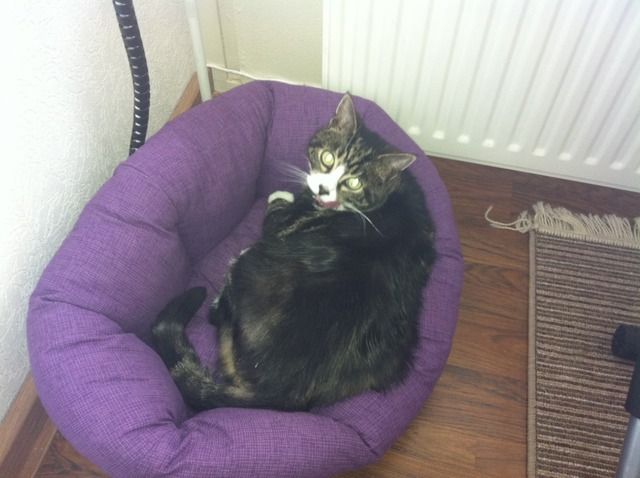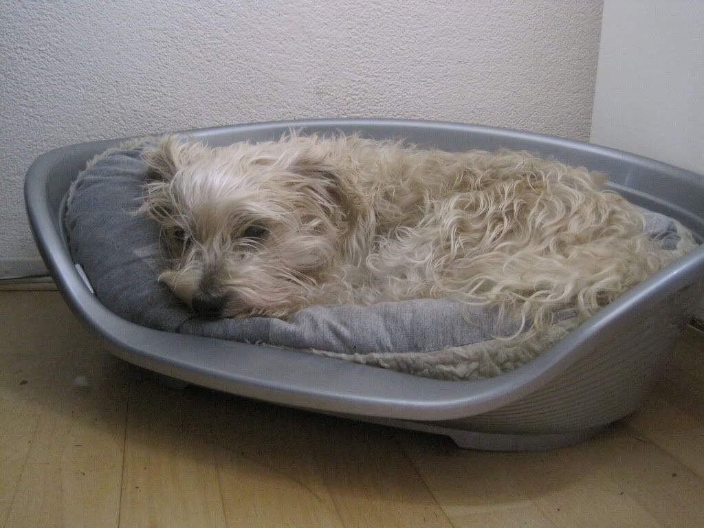Het gaat goed met Bob. Ze heeft vannacht bij ons op de kamer geslapen en vanmorgen vroeg zelfs een tijdje nog bij mij in bed. (meneer Maes heeft het niet gezien) Ze is nu weer vrolijk, gistermiddag/avond vond ik het maar een zielig hoopje hond. Ook haar pilletjes zijn erin gegaan als koek. Gewoon tussen een plakje ham en hap slik weg!