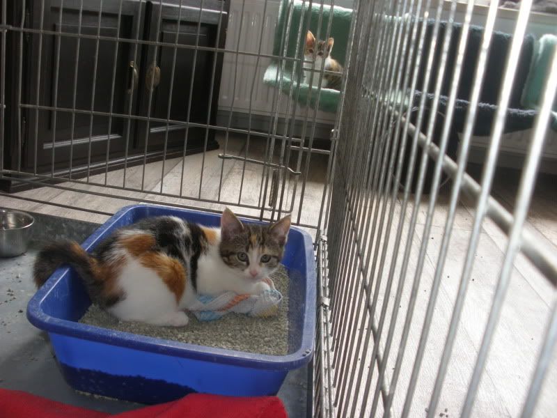 De dierenarts zei dat de ontlasting voor de uitgang zit dus dat het er zo wel een keer uit zal komen. Lana voelt zich duidelijk beter door die spuit. Ze probeer alweer op het zere pootje te staan en speelt nu samen met Lynn op het balkon ![]() | |