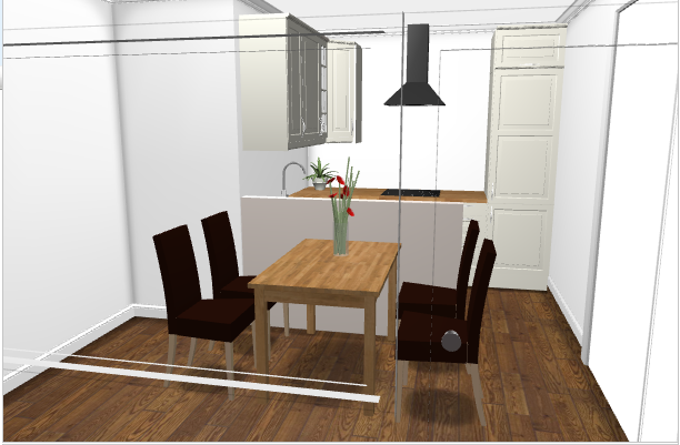 - Het muurtje tussen keuken en eethoek behangen: kant van de keuken wordt hetzelfde behang dat verder al in de keuken zit, kant van de eethoek weten we nog niet. (Of dezelfde kleur als het houtwerk, of dezelfde kleur als het behang van de keuken, of lichtgroen, of donkergroen, of....Help?)