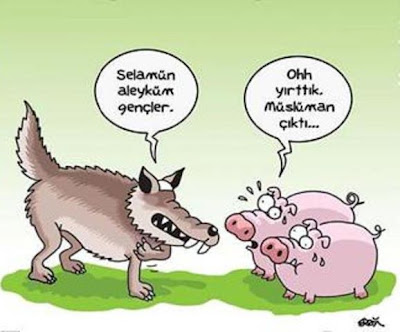 Wolf geeft moslimgroet, varkentjes zeggen: ooh gelukkig is hij moslim.