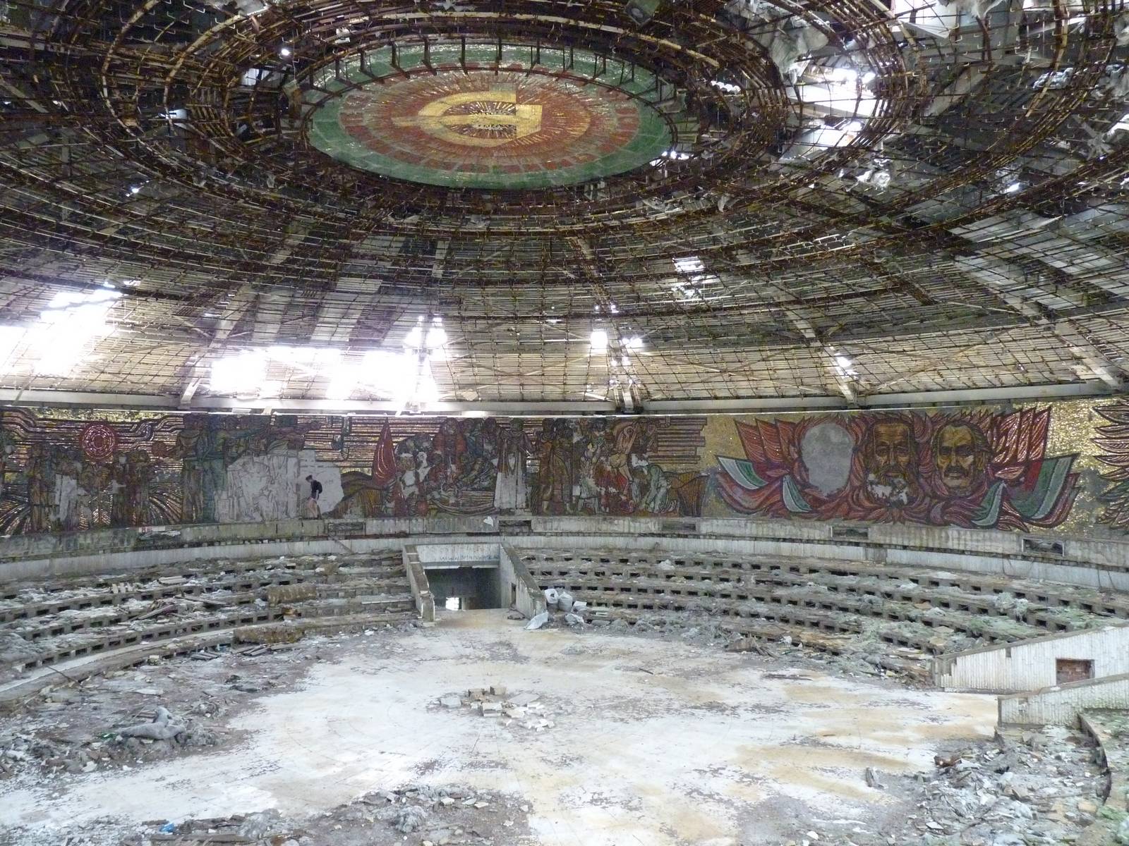 Buzludzha (geloof ik). Oud communistisch partijgebouw in Bulgarije, op een van de hoogste plekken van Bulgarije. Fucking vet. Inbreken ging door dit gat, waar die plank overheen ligt dus