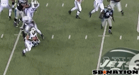 Hij is ook Personal Protector en ook dat vind ik niet eens een heel slecht idee, met de bal in zn hand is hij gewoon gevaarlijk en bijna een garantie voor 3-5 yards. Misschien dat de Jets snappen dat je hem moet gebruiken als Football player en niet perse als QB + het bijkomende voordeel dat hij Sanchez pusht