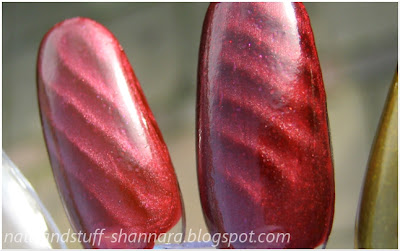 Mijn kleur is wat heftiger rood en de strepen zijn iets duidelijker, ik heb de magneet blijkbaar iets langer boven de nagel gehouden. Mijn nagels zijn trouwens ook korter.Je kan de magneet ook anders houden en dan krijg je verticale of horizontale strepen, sommige lakken hebben een stervormige magneet...heb nog niet geen variaties daarop gezien, zou het ook zo snel niet kunnen bedenken.
