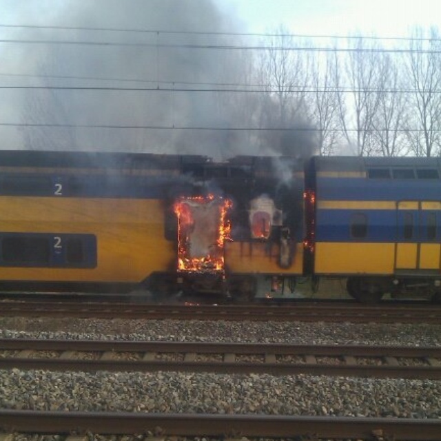 Brandweer mag ook pas blussen als de stroomafnemers naar beneden zijn en het treindeel los staat van de hoogspanning. | |