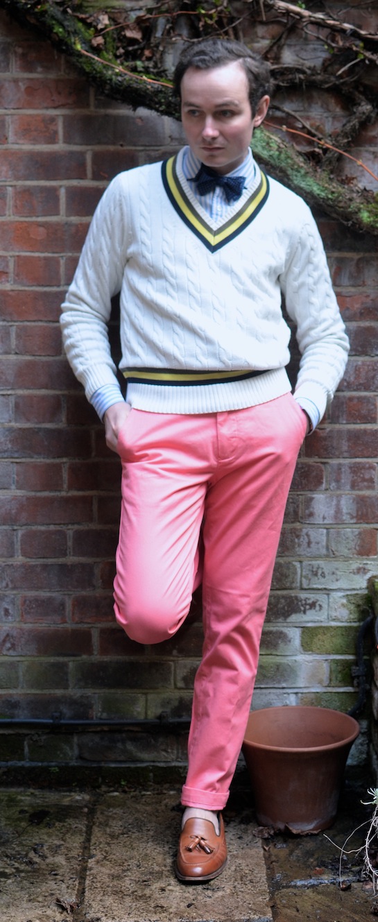 Ik heb eerlijk gezegd ook een beetje mijn twijfels met een roze chino. Geen idee hoe je het zou moeten combineren.