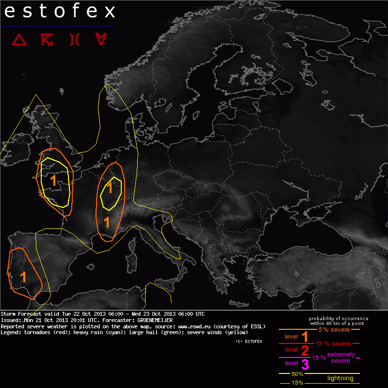 Within a warm and relatively moist air mass, storms are expected to develop during the evening across N and E France as mid-level temperatures drop slightly. Given the strong shear, these storms may develop rotating updraughts. The strong low-level flow and -shear suggests a threat of severe wind gusts will exist and an isolated tornado will also be possible. Some marginally severe hail is not ruled out either.