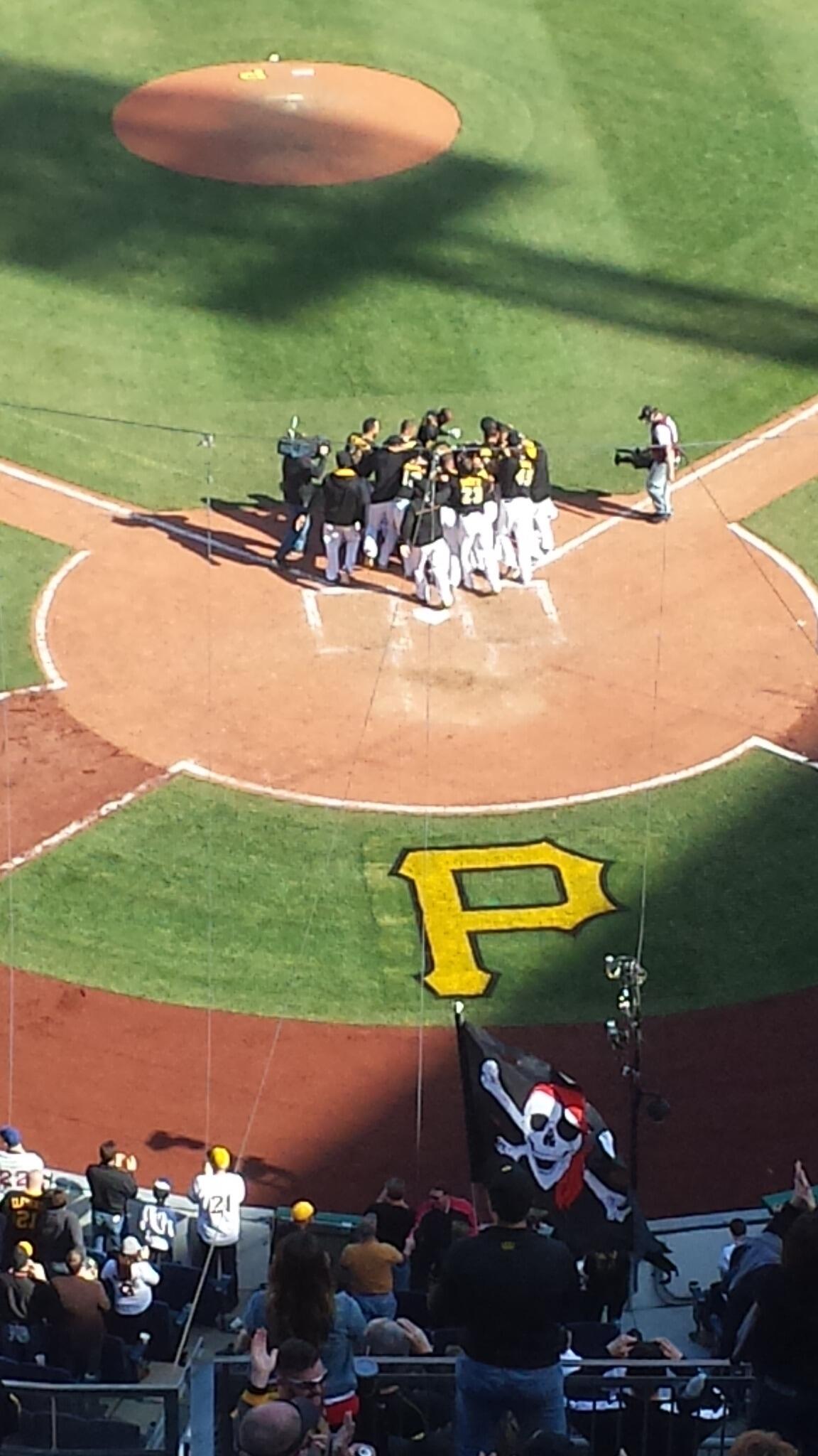 twitter:Pirates twitterde op maandag 31-03-2014 om 22:36:01Your Bucs greet @NeilWalker18 at home after his shot to right. #Walkoff #HometownHomer http://t.co/0bBbkzYeJ7 reageer retweet