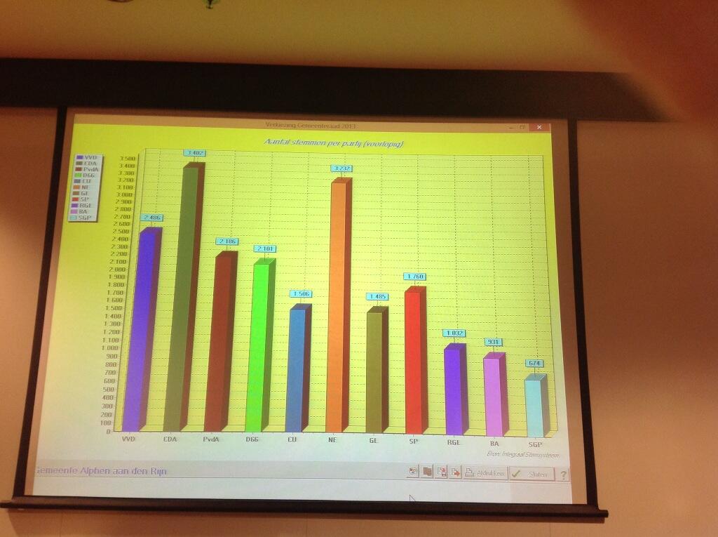 CDA en Nieuw Elan (de partij van Gerard van As, voorheen van de LPF) worden veruit de grootste in Alphen (tweederde is geteld), flinke winst voor beide partijen.