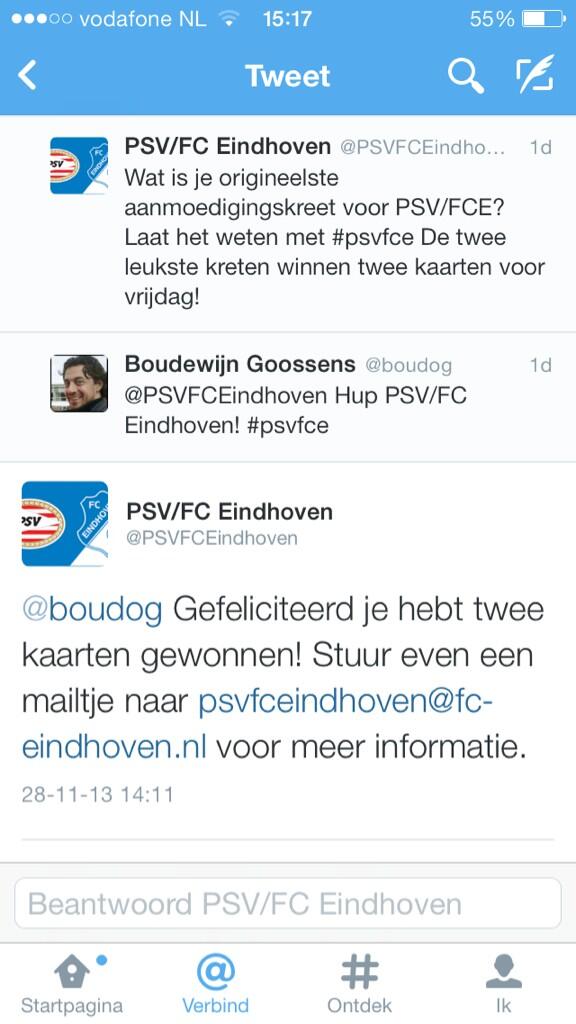[..]twitter:PSVFCEindhoven twitterde op donderdag 28-11-2013 om 16:22:09Hé... nu stromen de reacties ineens wel binnen! We zijn de flauwste niet, we verloten gewoon nog eens 2x2 kaarten. Dus kom maar op! #psvfce reageer retweet
