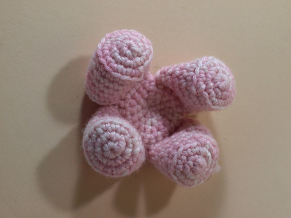 Als ik de beentjes vast wil haken aan de buik, dan komt de foute kant van het haakwerk toch buiten te zitten op deze manier?