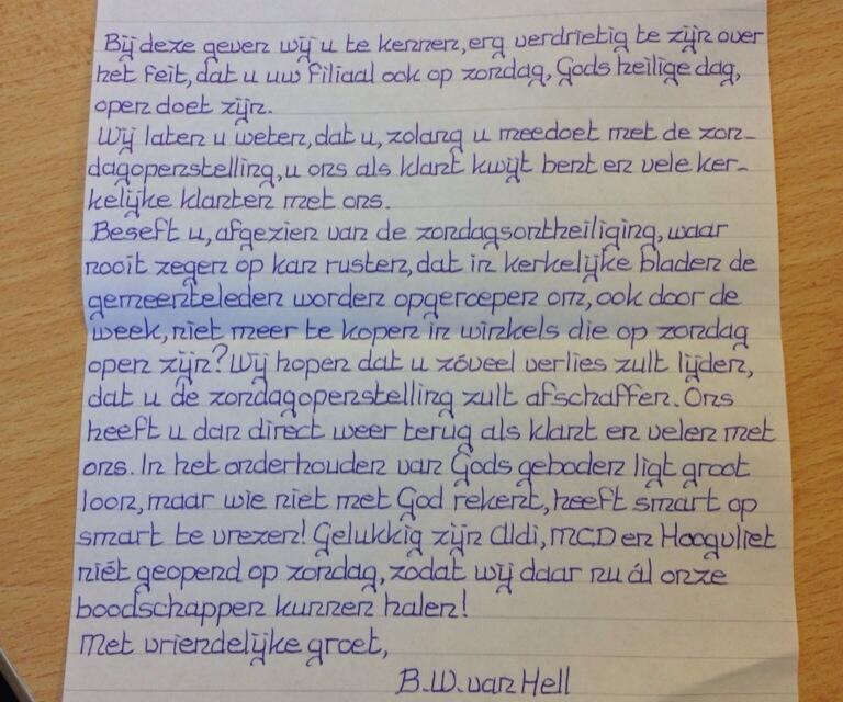 een brief die duidelijk geschreven is door een gelovige. manipulatie, dreiging en chantage om maar te zwijgen over eenzijdig mijn god hoe debiel moet je zijn om zo te reageren op iets dat je feitelijk geen drol aan gaat. dat hun de zondag als rust dag zien is best. rust lekker uit en laat degene die er anders over denken hun zondag beleven zoals ze dat willen.