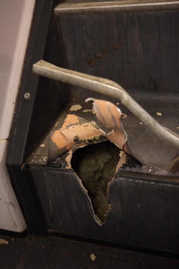 Op Twitter heeft een passagier uit de trein een foto geplaatst waarop te zien is dat er ook een gat zit in de trap van de trein.