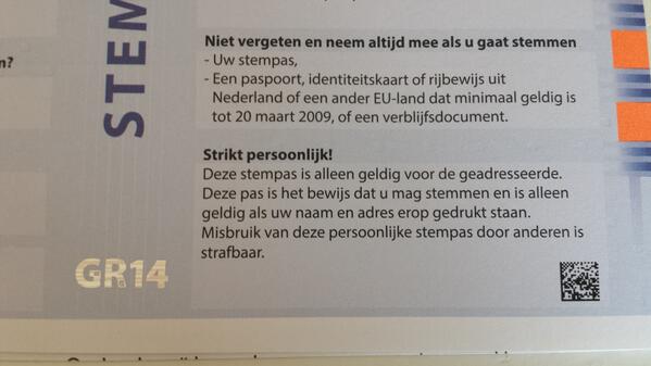 Bij sommigen is niet bekend dat legitimatiebewijzen 5 jaar verlopen mogen zijn bij verkiezingen. Die zien "20 maart 2009" als een drukfout. Op Twitter kwam ik al behoorlijk wat #fail tegen (daar komt die foto ook vandaan). Je kunt blijkbaar van de kiezer niet verwachten dat ze ook de achterkant van de stempas lezen.quote:Op woensdag 12 maart 2014 15:21 schreef 0ne_of_the_few het volgende: