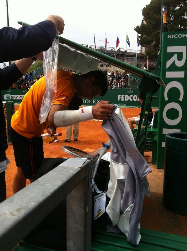 Djokovic breekt training af na 10 minuten, 5 services. Arm dik in het verband en er gaat het gerucht dat hij een injectie met pijnstillers gekregen heeft. Allemaal erg zorgelijk.
