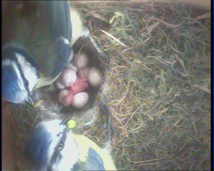 Je ziet het ook aan de reaktie van de vrouw als er net eitjes liggen. Als het mannetje dan de nestkast inkomt, begint ze eerst luid te protesteren, totdat ze ontdekt dat hij wat te eten heeft, dan pakt ze dat aan, waarna ze opnieuw begint met protesteren tot het mannetje weer naar buiten is.