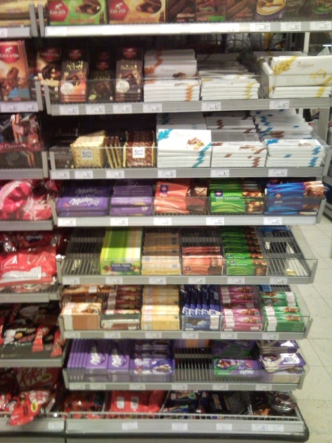 Die zijn opzich weer gevuld zijn met chocola dus dat slaat al helemaal nergens op, maar goed dat terzijde... Verder nog een heel schap met puur, extra puur, extra-extra puur plus nog allerlei verschillende percentages aan puur.