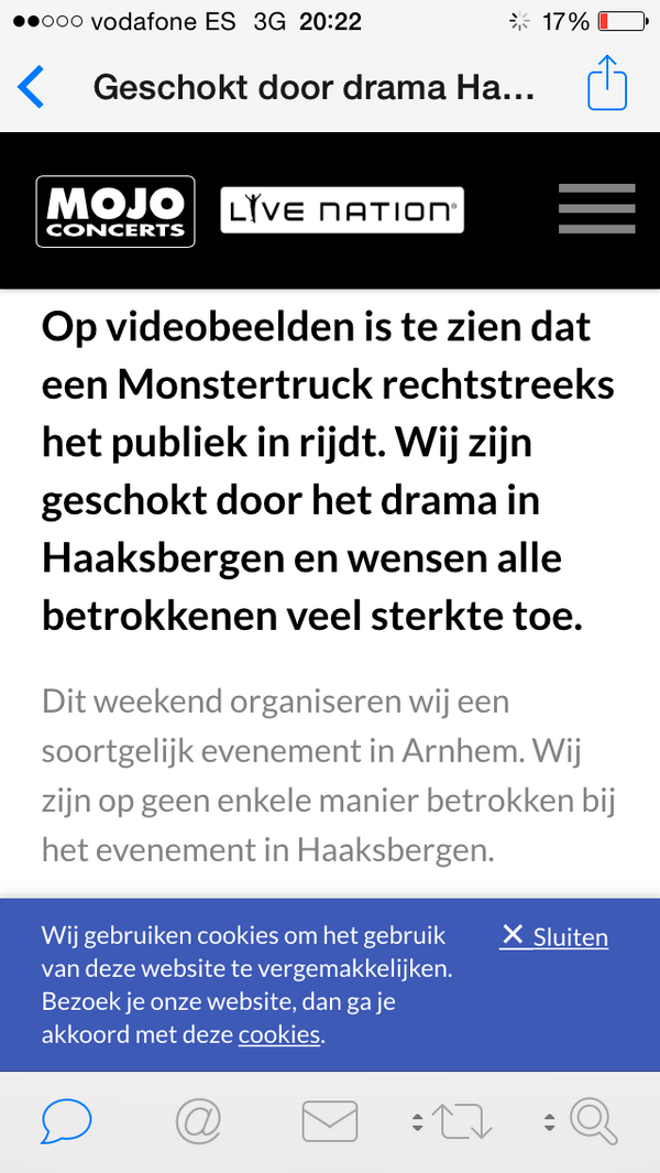 quote:Bij een evenement in het centrum van Haaksbergen is een monstertruck het publiek ingereden. Daarbij zijn drie doden gevallen, twee volwassenen en één kind. Ook zouden er zeker vijftien gewonden zijn. Van hen zijn vijf mensen ernstig gewond geraakt. Dat heeft burgemeester Hans Gerritsen van Haaksbergen bevestigd.